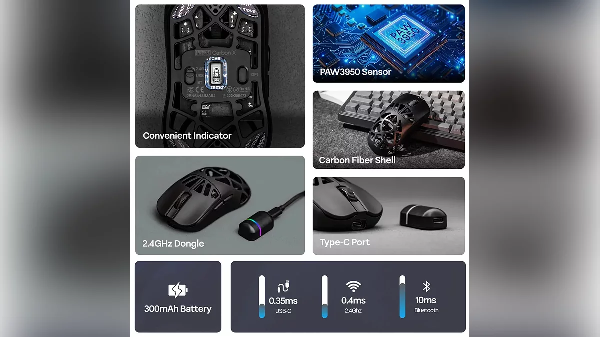 Главной новинкой можно назвать CarbonX с корпусом из карбонового волокна, благодаря этому решению и перфорированной конструкции корпуса производителю удалось достичь веса всего в 50 грамм. Также карбоновая конструкция должна обеспечить высокую прочность. Внутри мыши установлен сенсор PixArt PAW3950, который имеет частоту опроса 8000 Гц, что может дать преимущество в динамичных играх. Для кликов используются оптические свитчи Omron с заявленным ресурсом в 1 миллион нажатий.