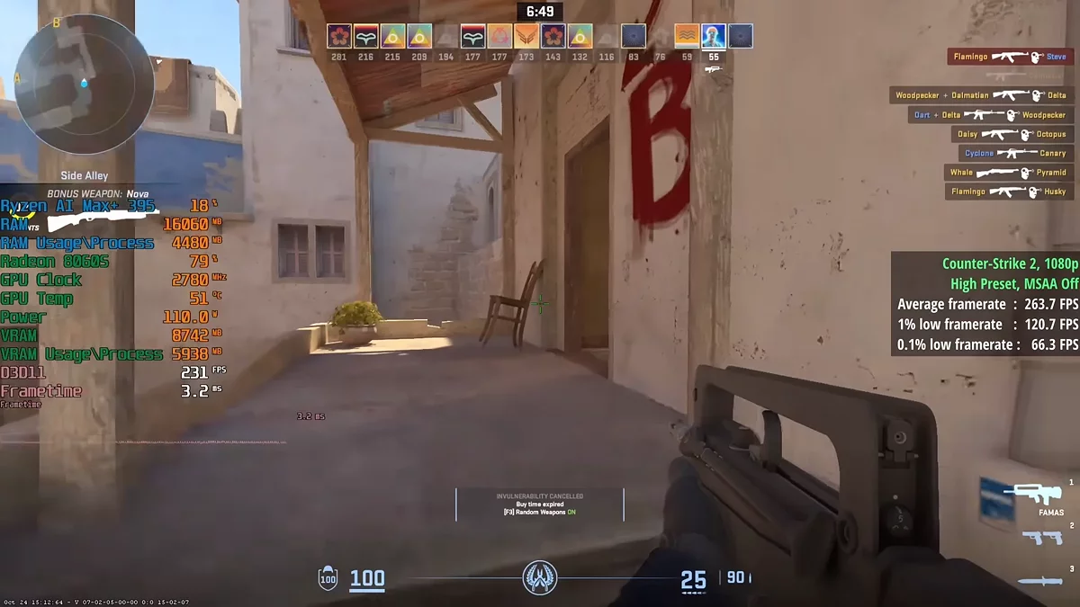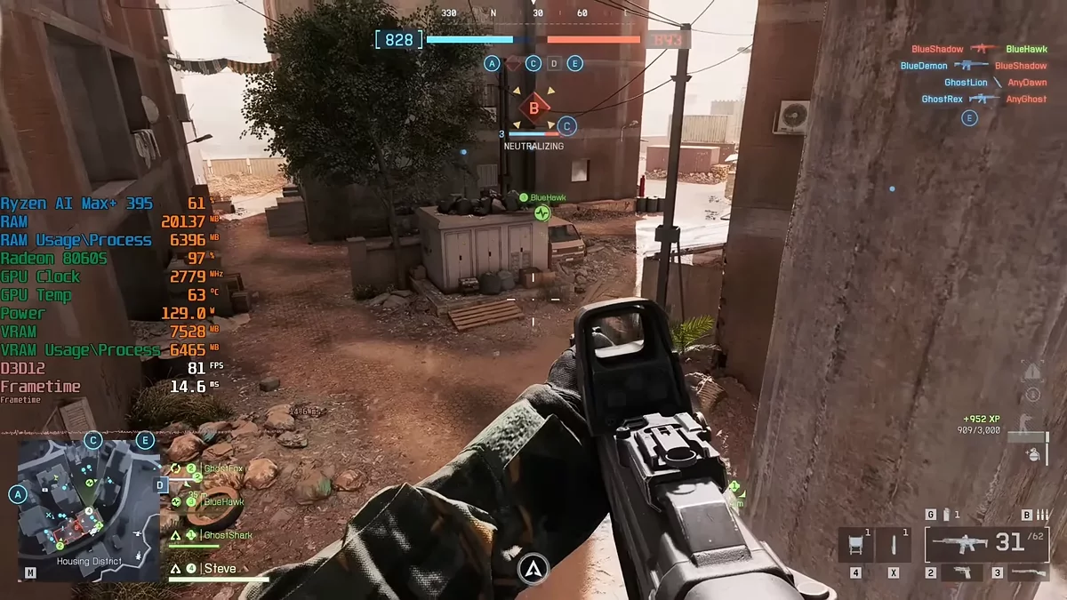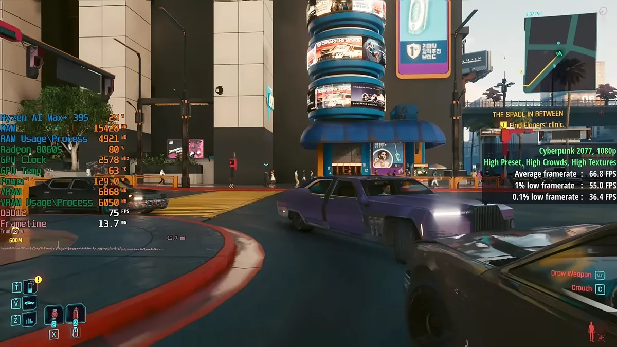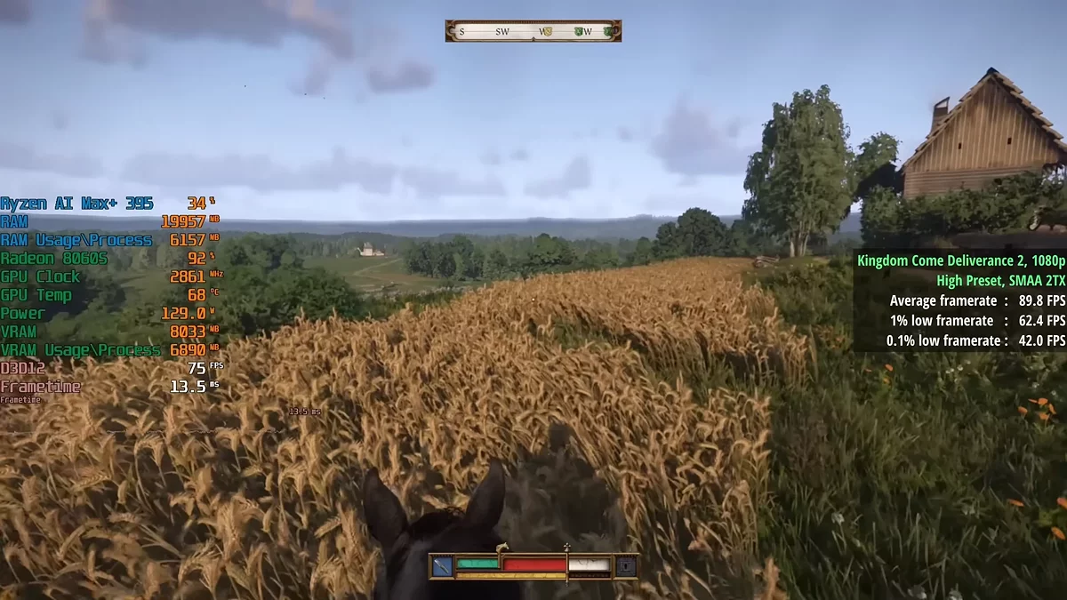 Тесты проводились в разрешении 1080p с активацией режима производительности в BIOS и результаты оказались неожиданными для системы без дискретной видеокарты. В Battlefield 6 на высоких настройках графики система выдавала стабильные 80-87 FPS. Cyberpunk 2077 работал на высоких настройках без трассировки лучей, показывая в среднем 67 FPS и даже с включенным RT на ультра-настройках и FSR 3 удалось добиться стабильных 45 кадров. Red Dead Redemption 2 (82 FPS на ультра-текстурах) и Kingdom Come: Deliverance 2 (90 FPS на высоких настройках), также не вызвали проблем.