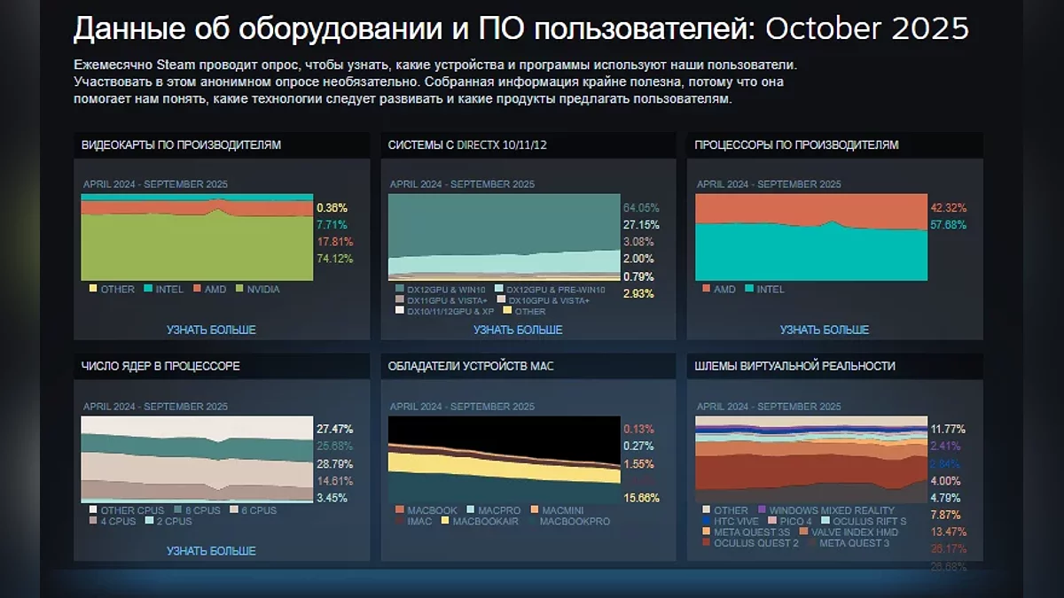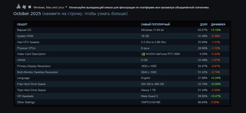 В Steam назвали «самые народные» ОС и «железо» за октябрь 2025 года