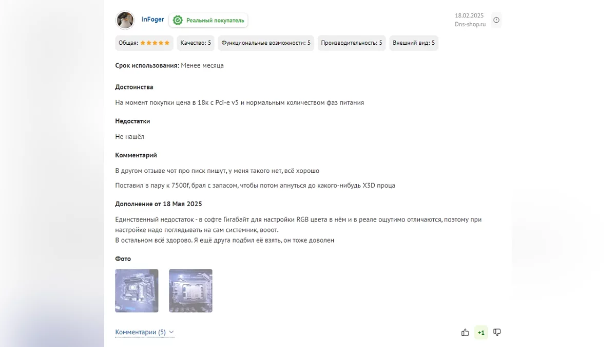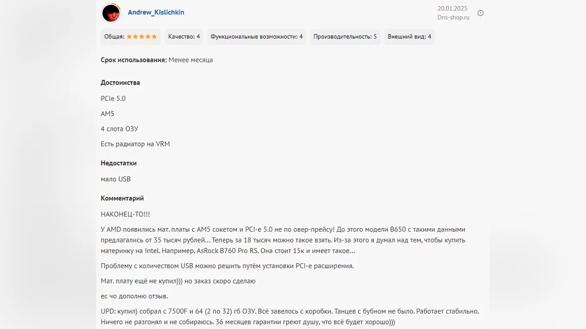 - Достойное соотношение цена/характеристики. За умеренные деньги получаете современный набор: поддержку AM5, DDR5, PCIe 5.0 на слоте для видеокарты и M.2;