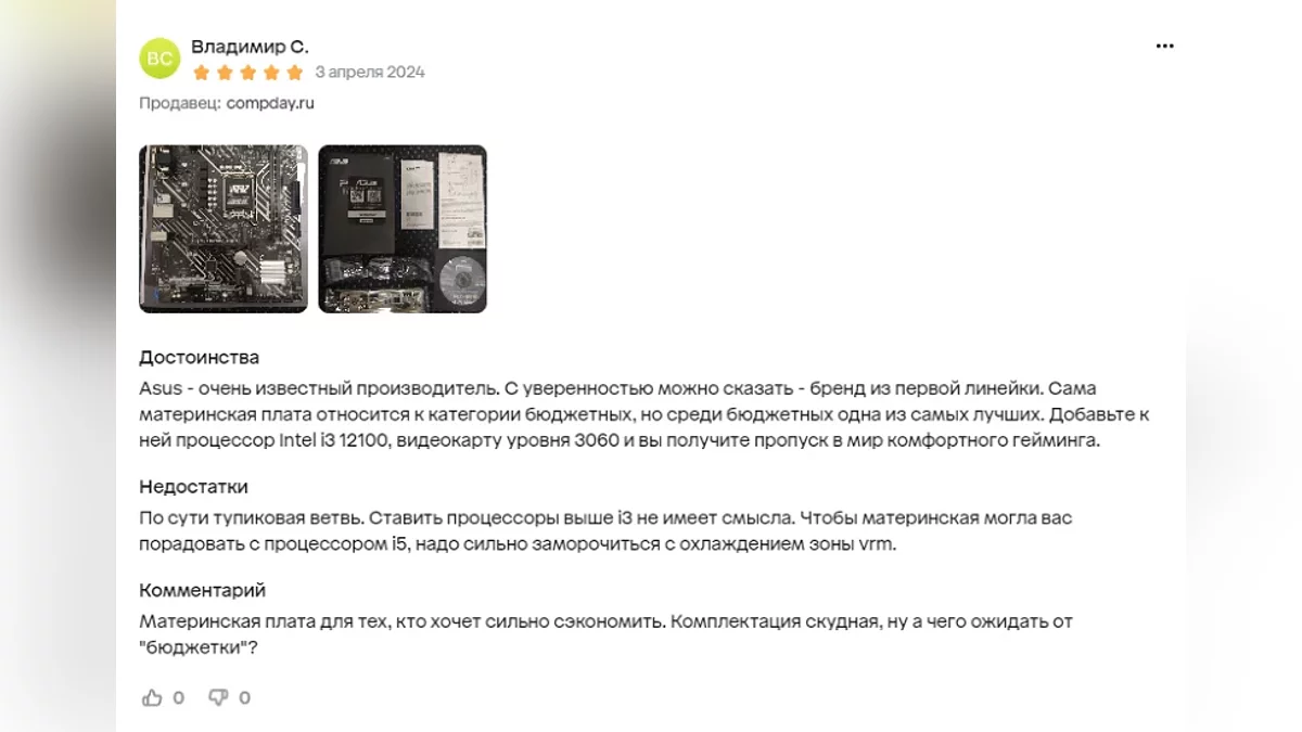 - Очень низкая цена и простая комплектация. Вариант для сборок без излишеств: материнка покрывает базовые потребности (видеокарта, 1–2 накопителя, базовый набор USB-портов). Отличный выбор для офисного PC или бюджетного игрового старт-билда;
