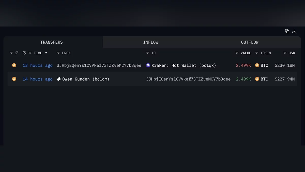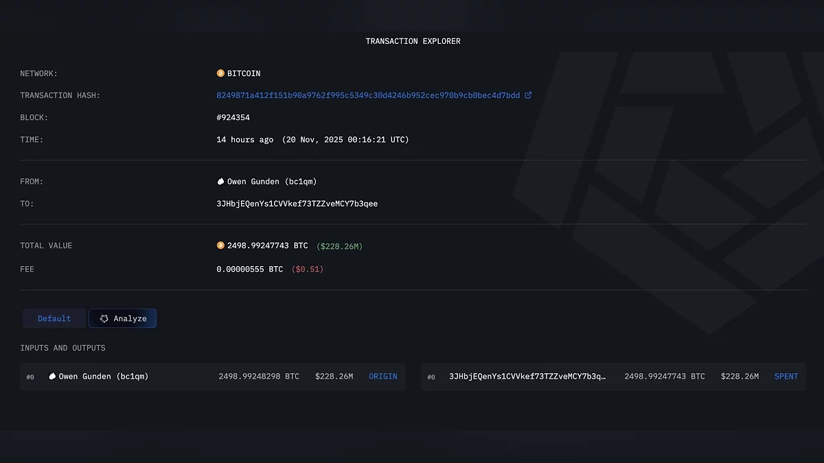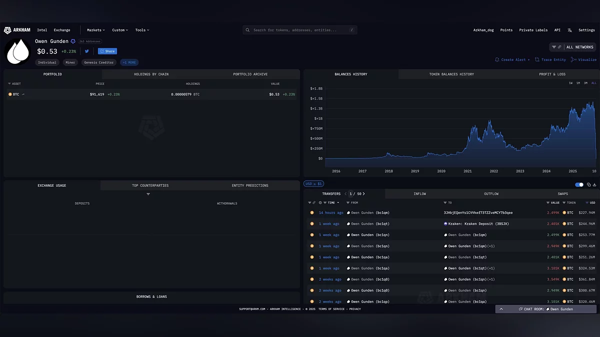 Оуэн Гунден (Owen Gunden), один из самых первых и богатых трейдеров Bitcoin, ушёл с крипторынка. За последний месяц он продал все свои запасы криптовалюты — около $1,3 млрд. По данным аналитической платформы Arkham, 20 ноября он перевёл последнюю часть своих активов — 2 499 BTC на сумму примерно $228 млн.