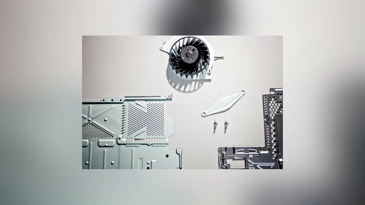 В заключение был продемонстрирован сам радиатор PS4, осуществляющий теплоотвод от компонентов материнской платы с помощью двух теплотрубок, и 85мм кулер, также имеющий эксклюзивный дизайн.