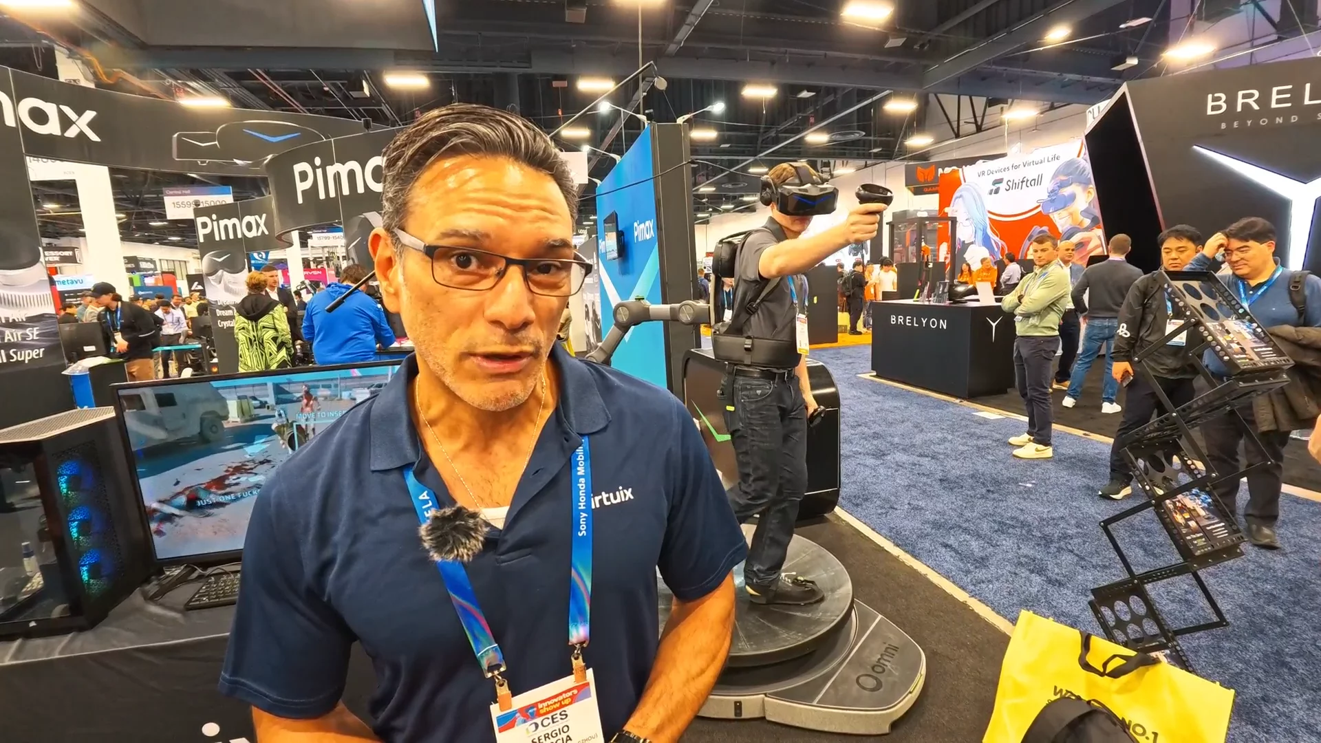 Серджио Гарсия: Меня зовут Серджио Гарсия, я директор по развитию бизнеса в компании Virtuix. Мы создали систему Omni One. Впервые в играх вы можете ходить и бегать на полной скорости с обзором на 360 градусов. Можно прыгать, вставать на колени и приседать — всё это даёт полное погружение в игровой процесс.
