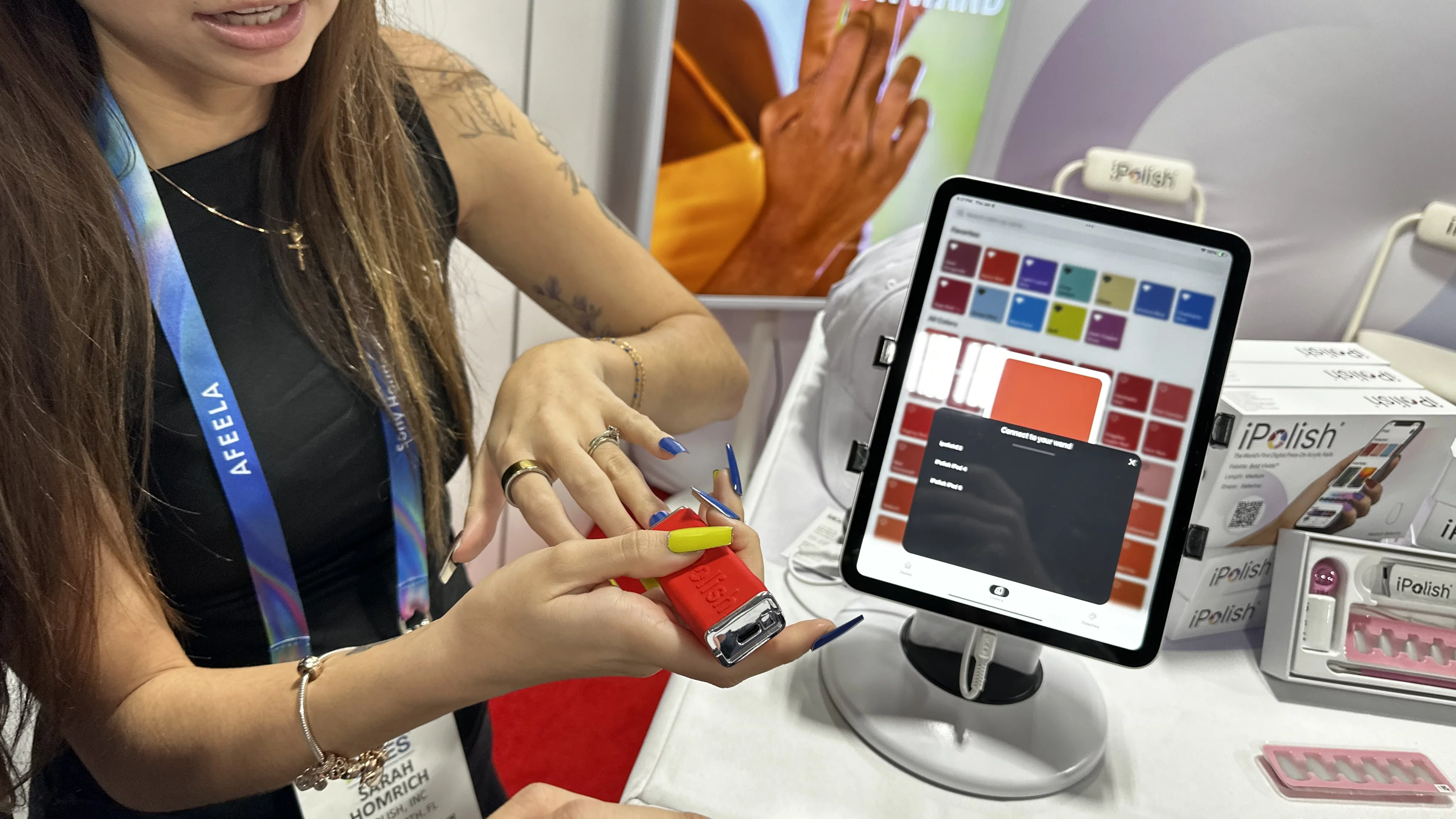 Сара Хомрич (Sarah Homrich): Здравствуйте. Это iPolish — первые в мире цифровые ногти. По сути, специальный аппарат для смены цвета подключается к мобильному приложению по Bluetooth. Вы выбираете нужный цвет в приложении, синхронизируете его с устройством, и когда вставляете ноготь, он мгновенно меняет цвет.