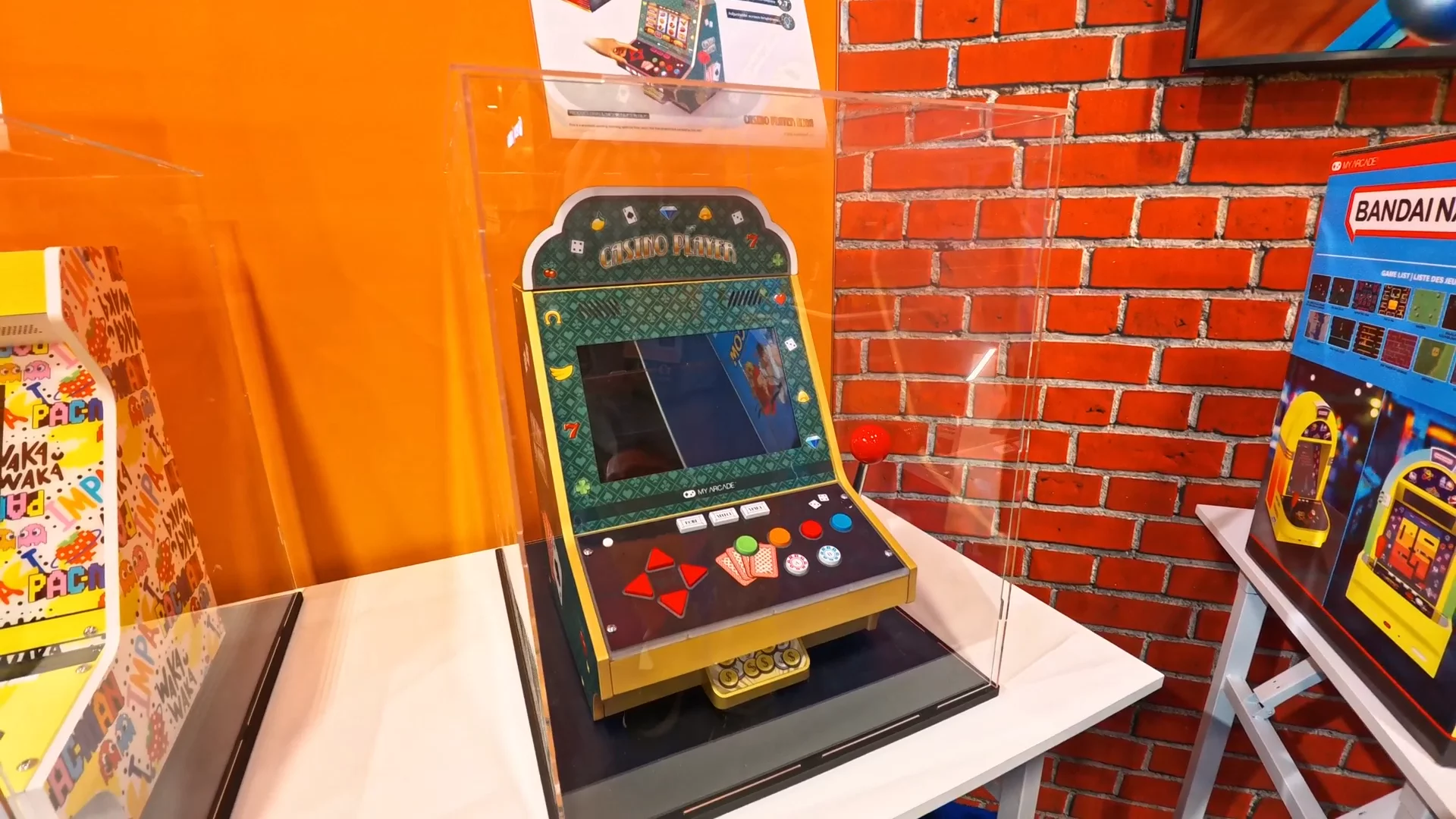 Затем он показал Jukebox Mega — систему по лицензии Bandai Namco, включающую Pac-Man, Dig Dug, Galaga, Xevious и другие игры. Помимо ретро-игр устройство поддерживает воспроизведение аудио по Bluetooth и оснащено динамиками и подсветкой, вдохновлёнными классическими джукбоксами, сочетая ретро-гейминг с винтажным дизайном.
