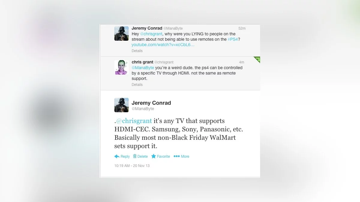 То есть PS4, конечно, можно управлять, но для этого нужен HDMI. Да и не каждый телевизор на такое способен. Но мы-то с вами знаем, что почти каждый имеет поддержку HDMI. Об этом также знает и наш коллега, который не преминул сказать об этом. Что в итоге, спросите вы. Да ничего. Господин Грант решил не решать проблему, а решил просто нагрубить тому, кто указал на его ошибку, а также заблокировать негодника в своем Twitter.