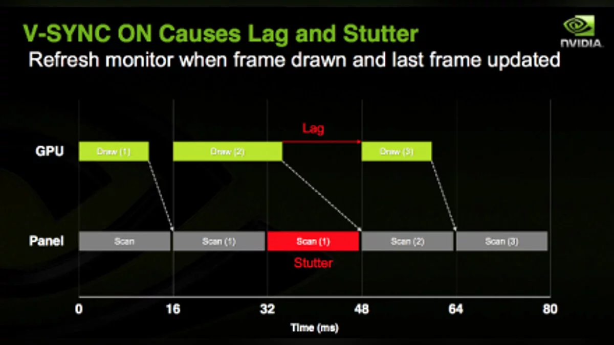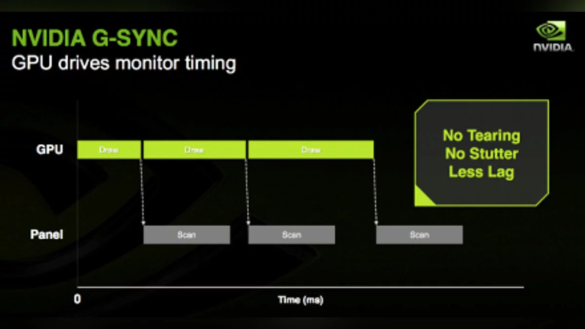 Иными словами, пользователю так или иначе приходится мириться либо с лагами, либо с артефактами, что, согласитесь, совсем не комильфо. Так же думали и инженеры Nvidia, явившие миру технологию G-Sync, которая заставляет монитор отображать старый кадр столько, сколько нужно для подготовки нового.