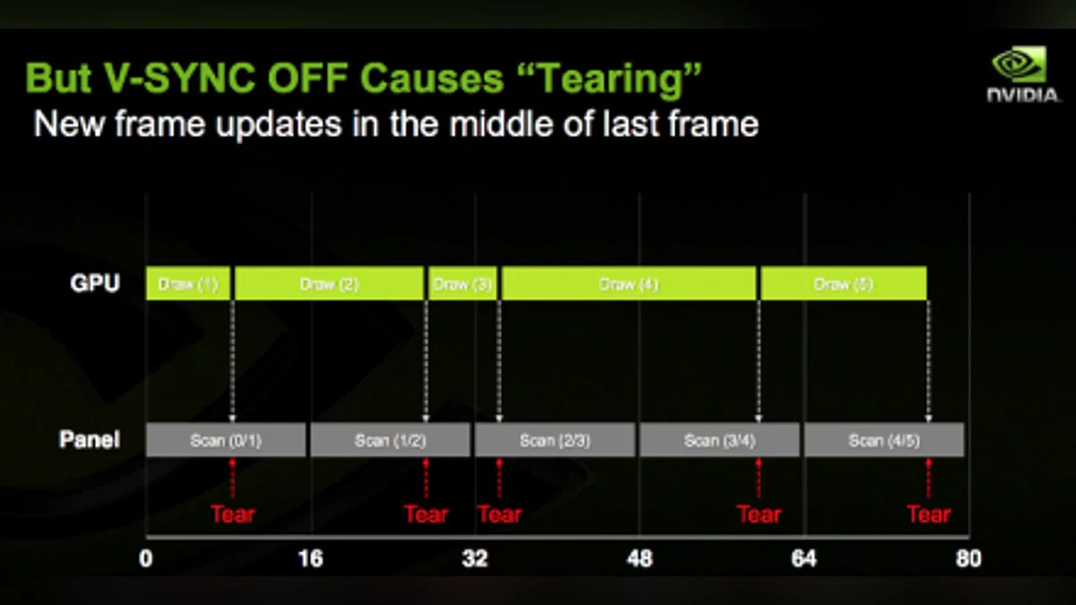 Но сперва немного о G-Sync. Всем известно, что стандартная частота развёртки кадров монитора составляет 60 Гц (120 и 144 на некоторых моделях), и поэтому видеоадаптер не всегда успевает подготовить новый кадр и синхронизировать его с частотой монитора. Это приводит к так называемым разрывам изображения (Screen Tearing):