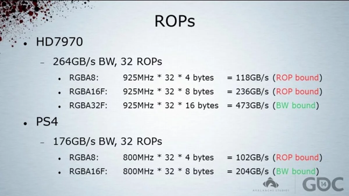 Хотя видеочип в PS4 сделал мощный шаг вперед по сравнению с PS3, некоторые его части отстали от современных тенденций. Количество блоков операций растеризации (ROP) в PS4 мало, а передача данных ограничена 64 битами. Это может ограничить производительность при обработке коротких шейдеров. В HD7970 разработчикам доступно 128 бит.