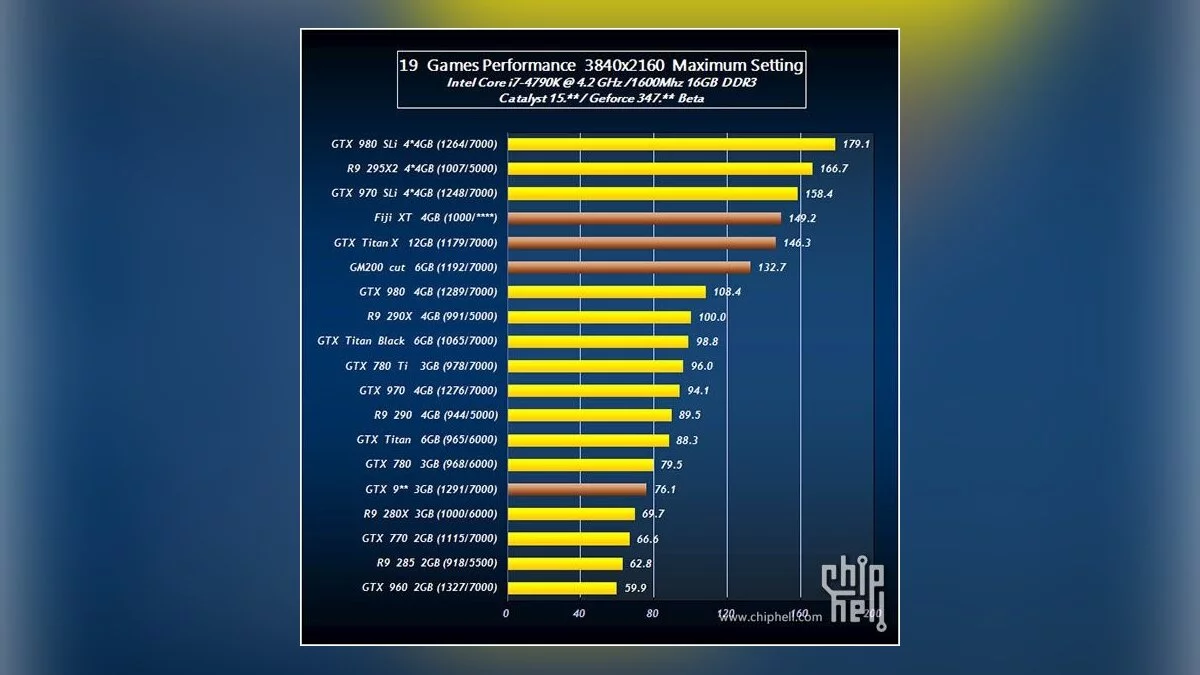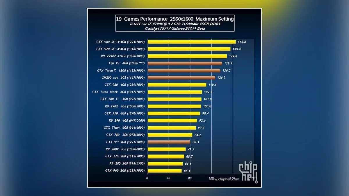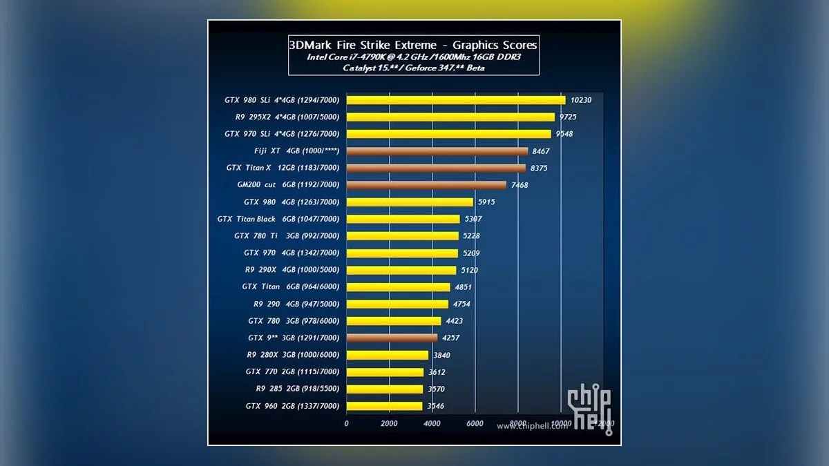 Китайский ресурс Chiphell порадовал бенчами целой своры новых видеокарт. Не обошлось без противостояния недавнего монстра GeForce GTX Titan X и новинки от AMD — Radeon R9 390X с чипом Fiji XT и новым типом видеопамяти.