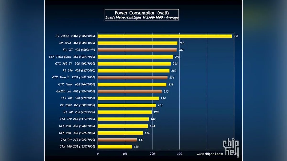 Titan X потребляет примерно тот же объём электроэнергии, что и обычный, а 980 Ti кушает на 11 ватт больше, чем 780. Интересен тот факт, что аппетиты 390X чуть ниже, чем у 290X, и интересен потому, что на борту новинки поместилось 4096 GCN-ядер, не под стать 290X с её 2816-ю. Возможно, снизить энергопотребление удалось за счёт новых технологий, уже нашедших своё применение в процессорах Carrizo на ядрах Excavator.