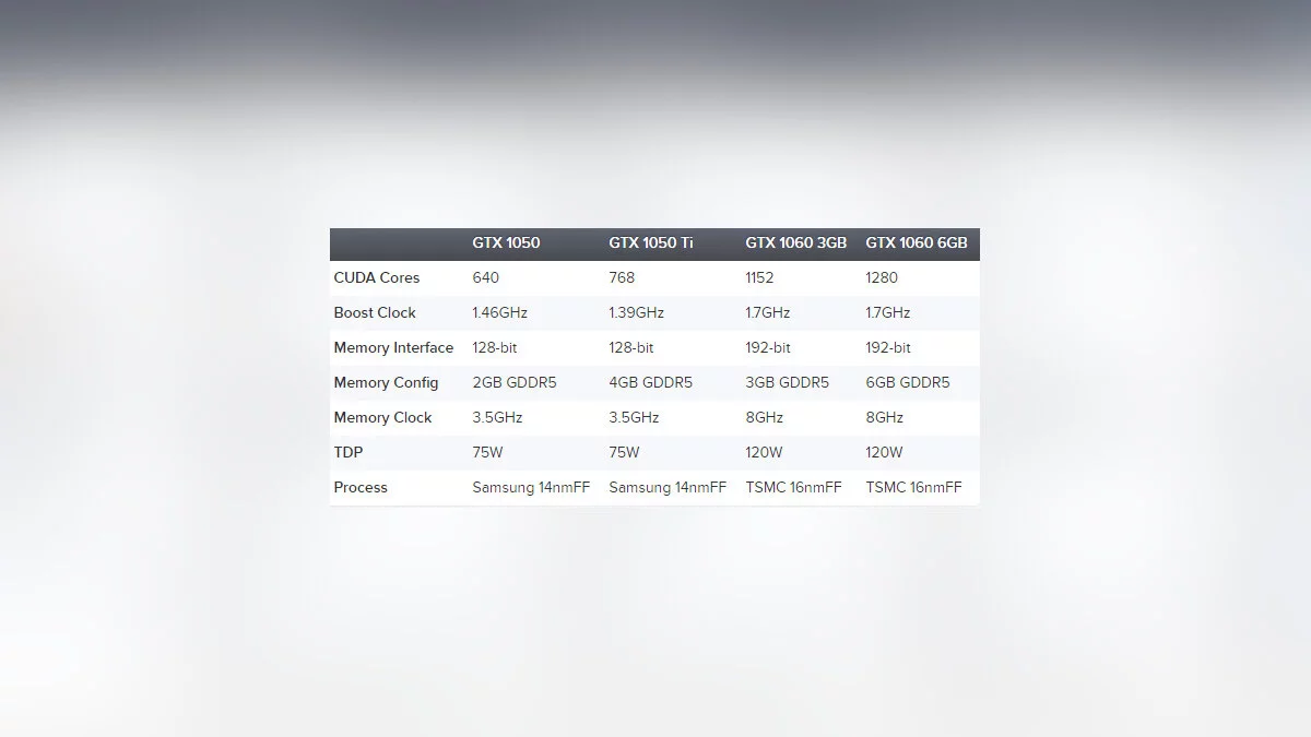 Новые видеокарты Nvidia основаны на архитектуре Pascal под кодовым названием GP107, а также имеют низкое энергопотребление (всего 75 Вт) и построены с применением 14-нанометрового технологического процесса. GTX 1050 имеет 2 ГБ видеопамяти, 640 ядер CUDA, частоту буста 1,46 ГГц и частоту памяти 3,5 ГГц. У GTX 1050 Ti данные параметры схожи, за исключением частоты буста (1,39 ГГц), видеопамяти (4 ГБ) и CUDA-ядер (768). Обе видеокарты имеют частоту шины 128 бит.