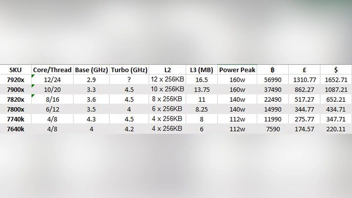 Тайский ритейлер Gameolo опубликовал данные о стоимости новой линейки процессоров от Intel. Речь идет о моделях Core i7-7640K, Core i7-7740K, Core i9-7800X, Core i9-7820X, Core i9-7900X и Core i9-7920X, которые должны стать ответом на решение от AMD, а именно Ryzen 7.