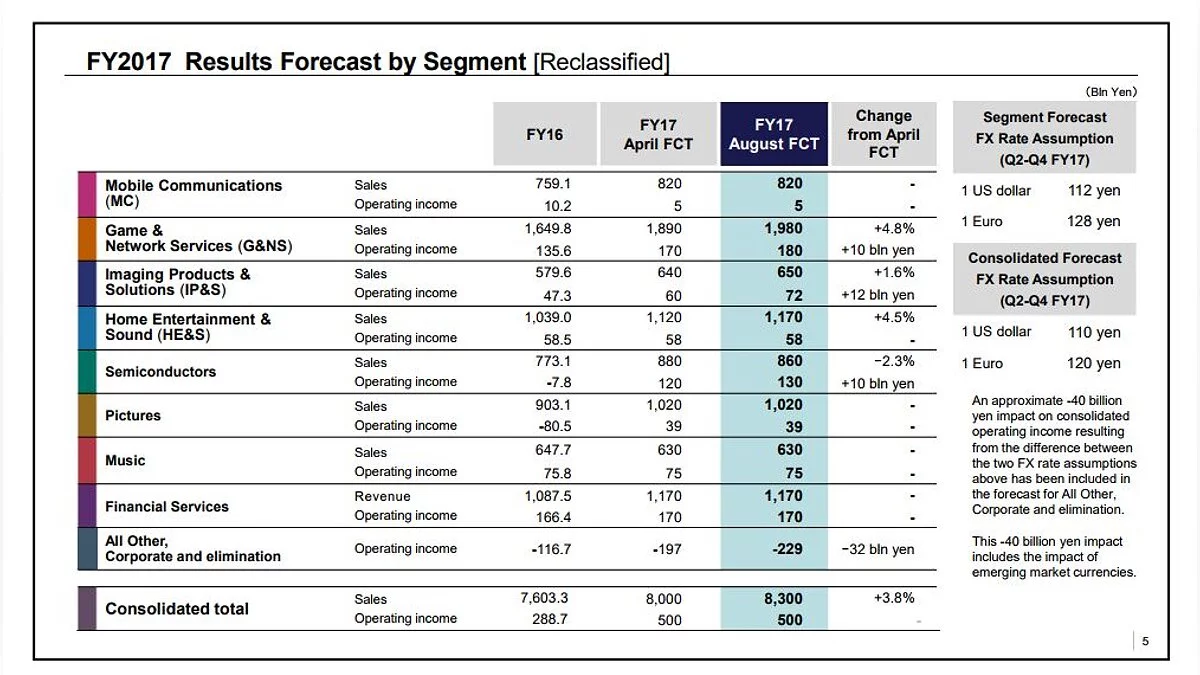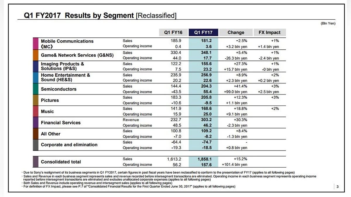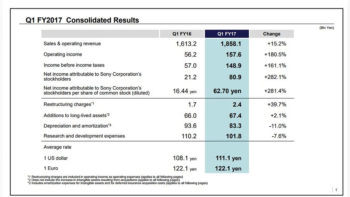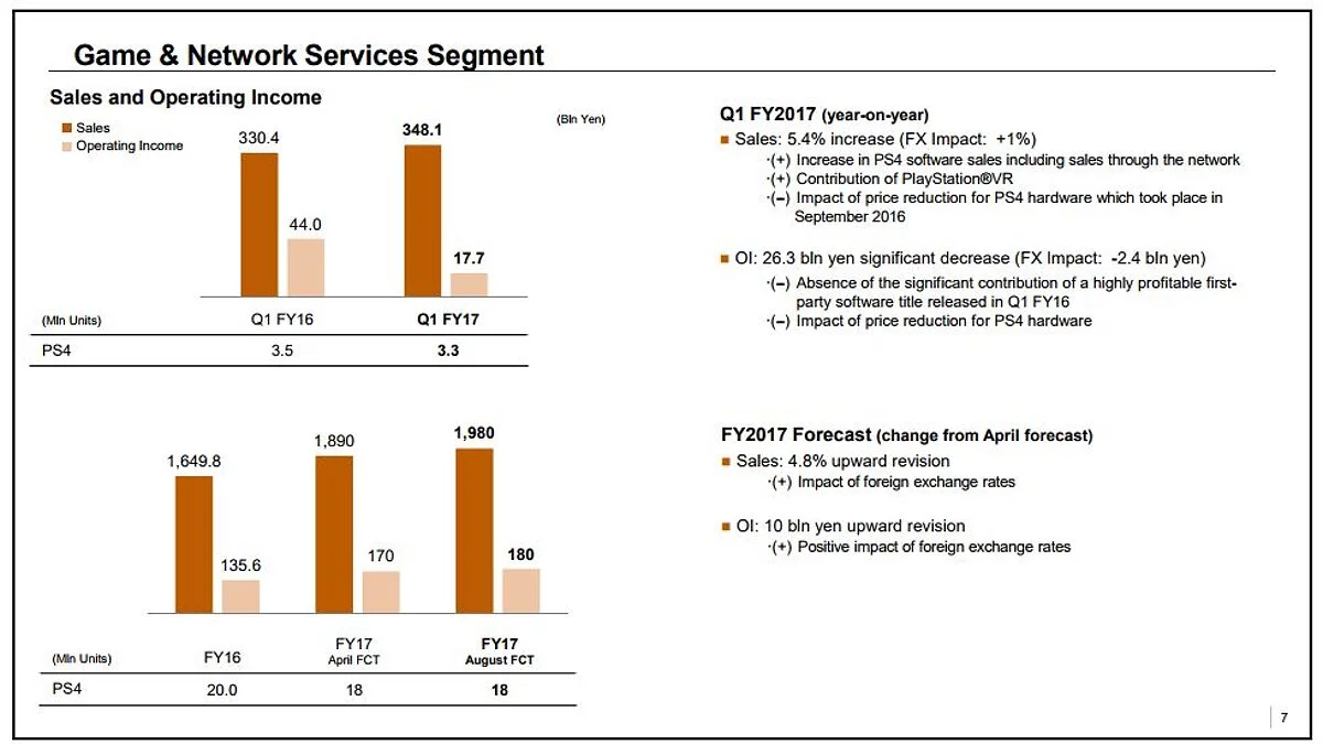 Общие продажи выросли на 5,4 % по сравнению с предыдущим годом и достигли 348.1 миллиардов йен. В целом такой рост можно объяснить увеличением продаж игр, включая цифровые версии, а также серьезным вкладом устройства виртуальной реальности PlayStation VR.