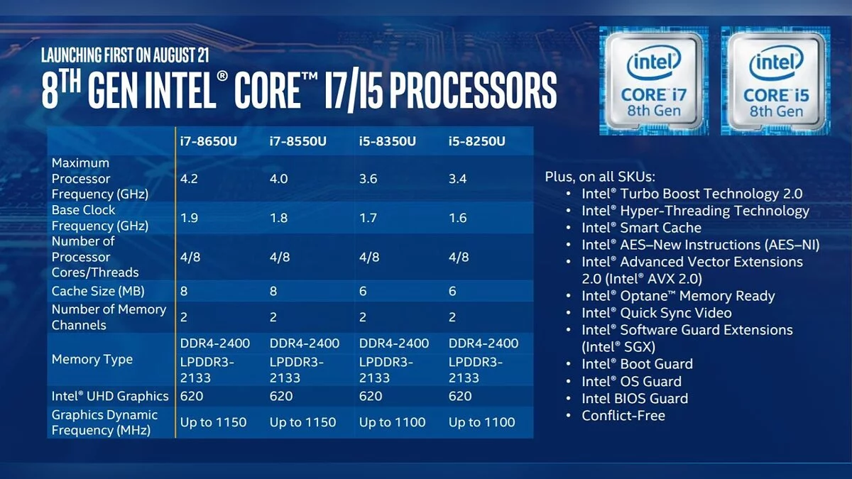 Младшей моделью в линейке будет Intel Core i5-8250U (скорости от 1.6 ГГц до 3.4 ГГц), а старшей — Intel Core I7-8650U (скорости от 1.9 ГГц до 4.2 ГГц). Все процессоры имеют по четыре ядра, но, как обычно, процессоры линейки Core i7 окажутся быстрее.