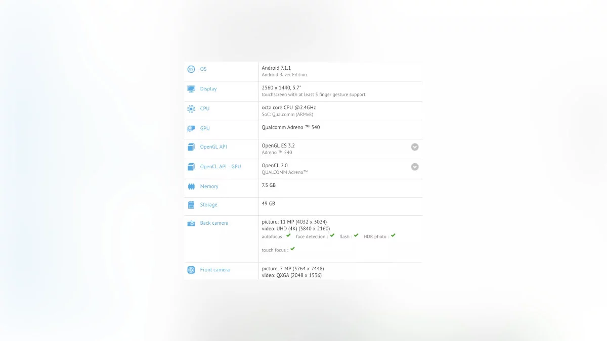 По некоторым данным, смартфон будет называться Razer Phone и получит следующие характеристики: 12 МП основную камеру и 8 МП фронтальную, 5,7 дюймов дисплей с разрешением 2560x1440p (примерно такой же, как у LG G6), процессор Snapdragon 835, 64 ГБ встроенной памяти и 8 ГБ оперативной памяти.