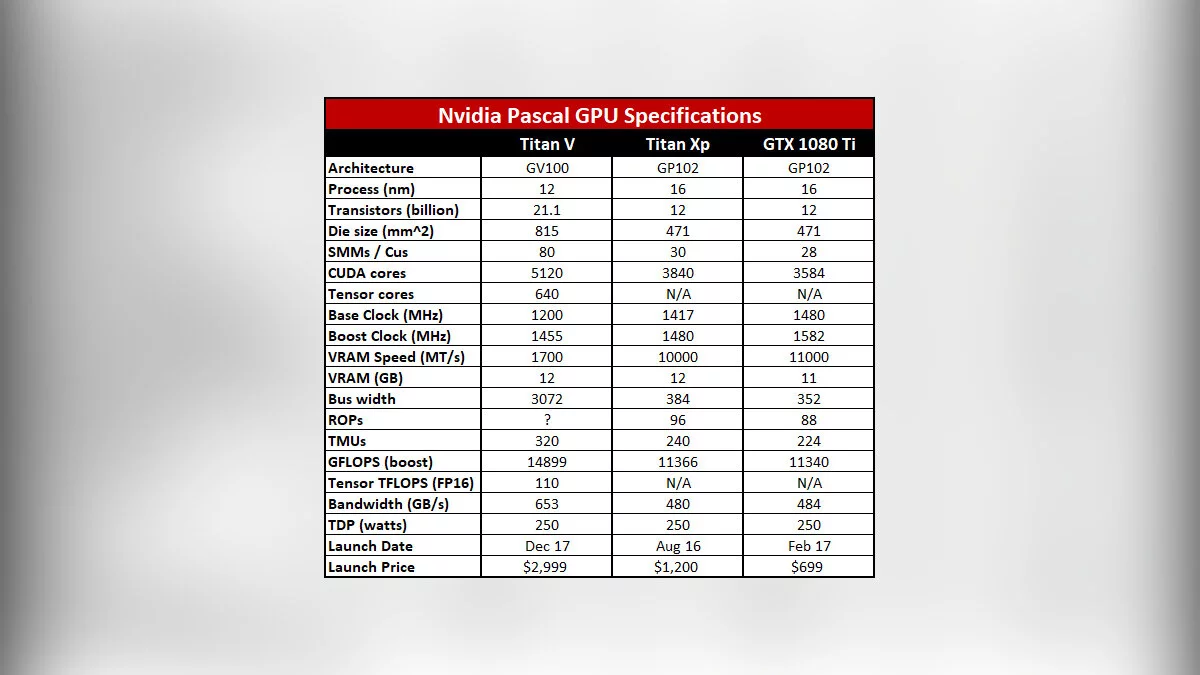 Выше представлено подробное сравнение всех характеристик таких видеокарт, как Titan V, Titan Xp и GTX 1080 Ti.