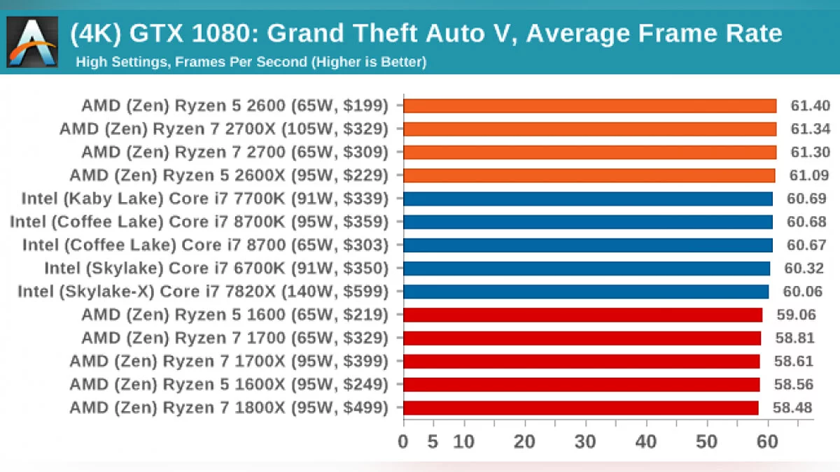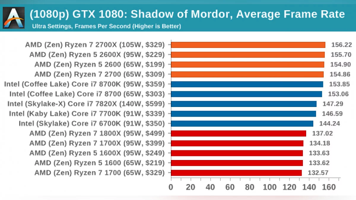 Вновь Ryzen второго поколения показывают потрясающий результат, причём даже в 4К разрешении. Последний тест — это боевая сцена в зрелищной Shadow of Mordor от Monolith Productions с настройками на максимум. В этом испытании себя нелохо показал процессор i7 8700K, однако новая линейка от AMD всё равно заняла все 4 первых места.