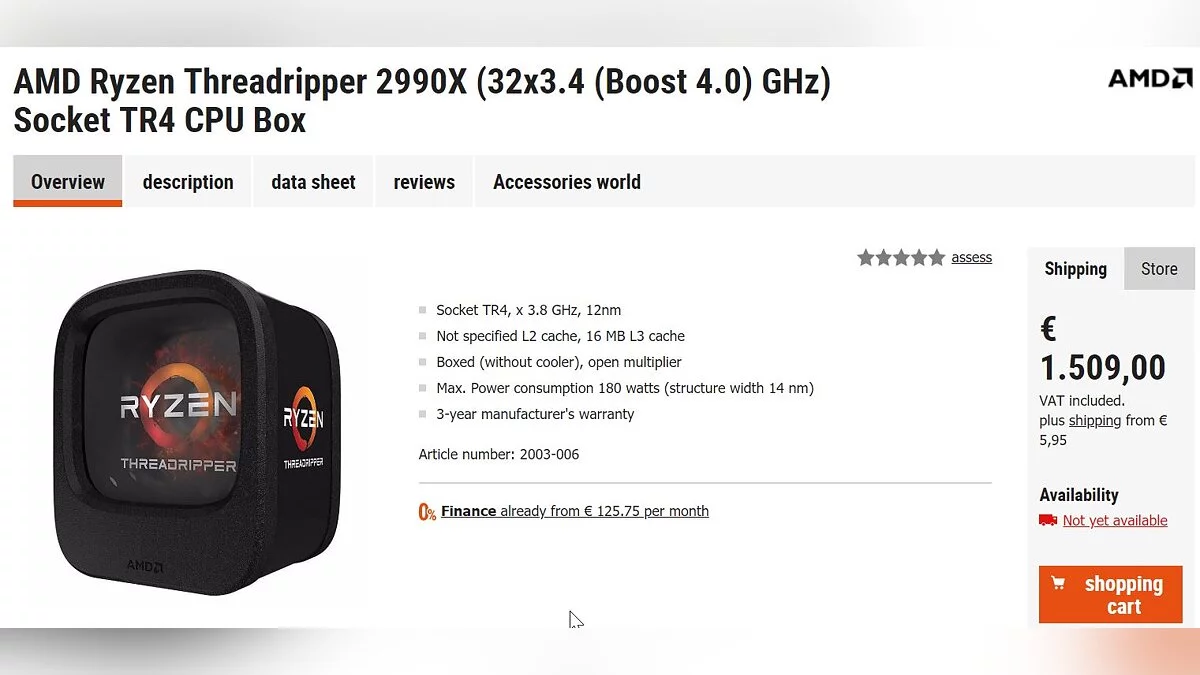 На днях немецкий ритейлер слил в сеть точную стоимость 32-ядерного процессора AMD Ryzen Threadripper 2990X. Чуть позже страницу с ценой удалили, но внимательные пользователи успели сделать скриншот. Помимо этого, в базе данных 3DMark были найдены точные характеристики процессора.