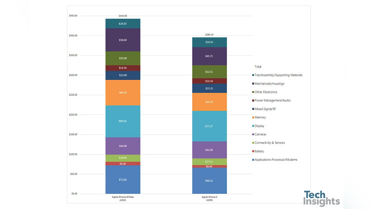 Больше всего новые смартфоны от Apple, анонсированные пару недель назад, удивили многих не инновационными технологиями, а своими ценами. Сайт Techinsights решил разобраться и узнать, сколько же на самом деле стоят компоненты одной из новинок, а именно iPhone Xs Max.