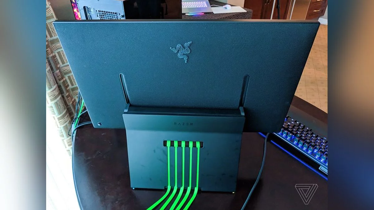 Монитор может похвастаться почти безрамочным дизайном, специальными плоскими кабелями зеленого цвета и фирменной подсветкой Chroma — без нее не обходится ни одно устройство компании. Основание изготовлено из кованого алюминия, а задняя панель обита тканью.