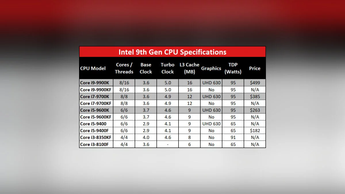Все новые процессоры получили приставку F. Они полностью идентичны предыдущим моделям процессоров, за исключением интегрированной графики UHD 630. Исключением является разве что модель Core i3-9350KF — четырехъядерник с функцией Turbo Boost для разгона частоты с 4,0 до 4,6 ГГц.