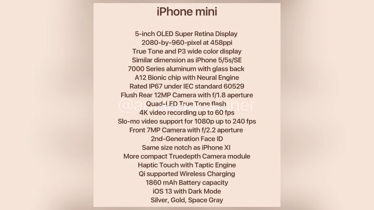 Согласно последней информации, iPhone SE 2 будет называться iPhone mini. Спереди телефон выглядит как миниатюрный iPhone XS, а дизайн задней панели выполнен в стиле iPhone SE. Размер корпуса близок к iPhone SE. Также устройство имеет защиту от пыли и влаги стандарта IP67 и будет продаваться в трех цветах: серебристом, золотом и космическом сером.