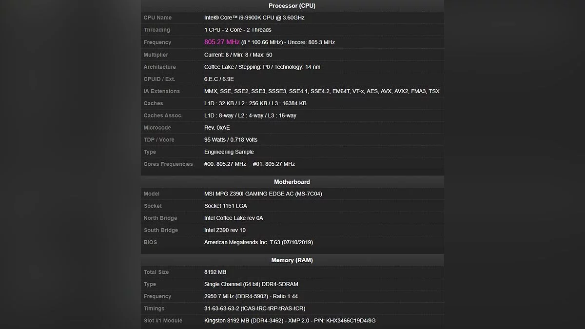 Для этого он использовал материнскую плату MSI MPG Z390I Gaming Edge AC и процессор Intel Core i9-9900K с отключенными 6 ядрами и Hyper-Threading.