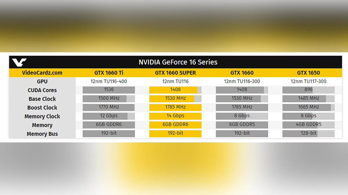Как можно заметить, Nvidia GeForce GTX 1660 Super будет отличаться от обычной GTX 1660 лишь более высокой частотой памяти — 14 ГГц (GDDR 6) против 8 ГГц (GDDR 5).