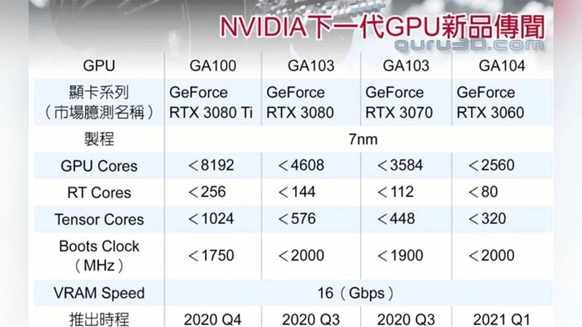 Портал Guru3d.com, ссылаясь на инсайдера chiakokhua, опубликовал даты выхода и характеристики новых видеокарт от Nvidia — RTX 3080 Ti, RTX 3080, RTX 3070 и RTX 3060.