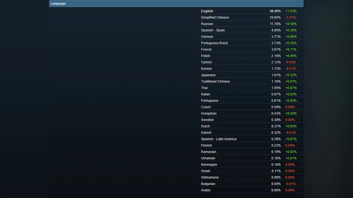 Количество русскоязычных пользователей Steam в апреле выросло на 0,50% (11,76% в целом). На первом месте находится английский язык — 38,49%. Второе же место занимает китайский язык. Его доля 19,65%, что ниже на 2,21%, чем в прошлом месяце.