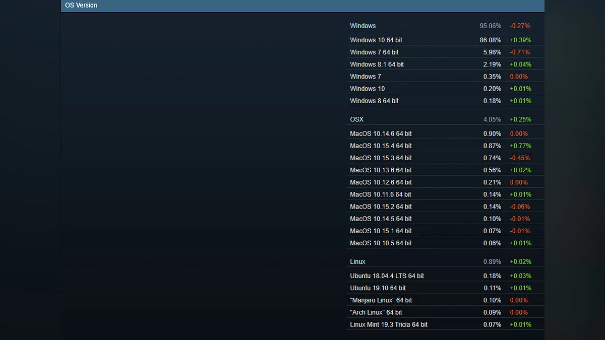 Что касается ОС, на первом месте среди Windows располагается «десятка» (64 bit) с долей 86,08%, а уже после нее следует «семерка» (64 bit), которую в апреле предпочли 5,96% пользователей.