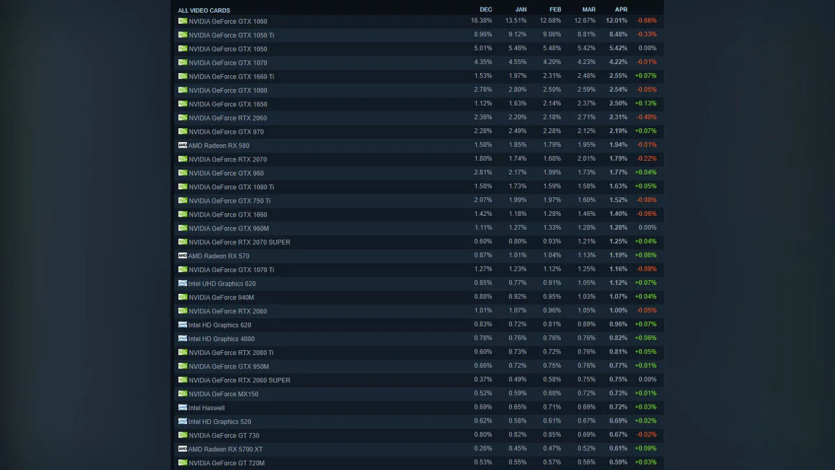 Тройка самых популярных видеокарт практически не изменилась. Там все еще находятся GeForce GTX 1060 (12,01%), GeForce GTX 1050 Ti (8,48%) и GeForce GTX 1050 (5,42%) от Nvidia.