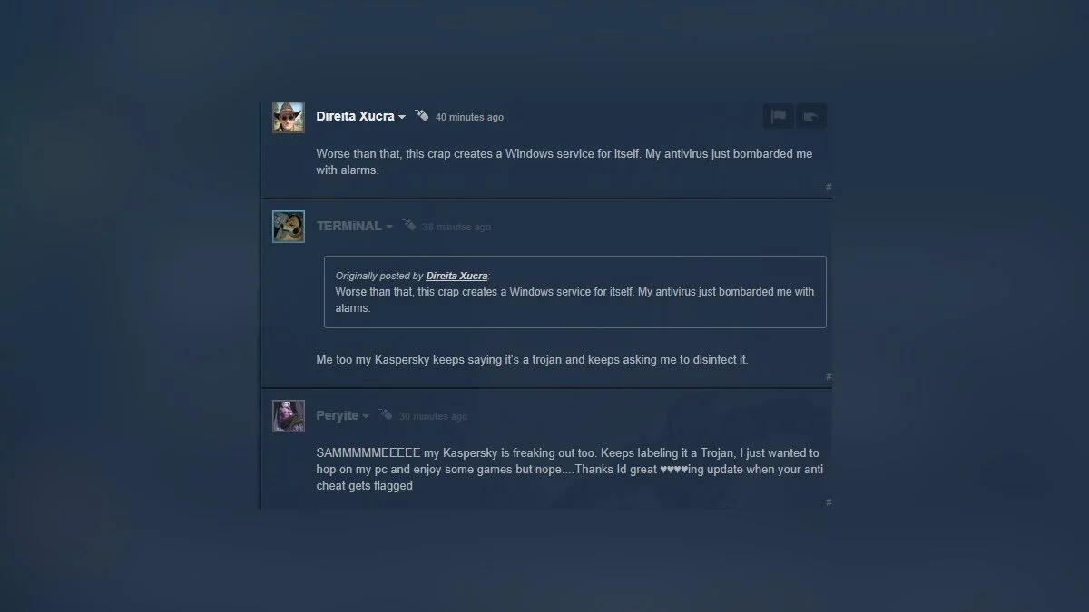 ТОЖЕ. Мой Kaspersky сходит с ума. Продолжает помечать его как троян. А я только хотел включить мой комп и поиграть. Спасибо, ID, отличный б******* апдейт, когда ваш античит подозревают в вирусах.