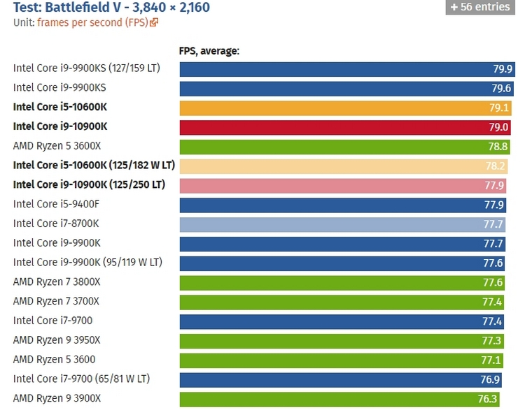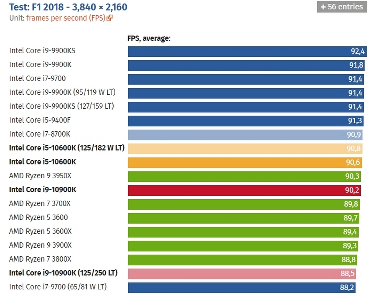 В играх, судя по тестам, Core i9-10900K заметно обходит конкурентов, показывая более высокую производительность. При этом в разрешении 4K процессор почему-то немного уступил прошлым моделям.