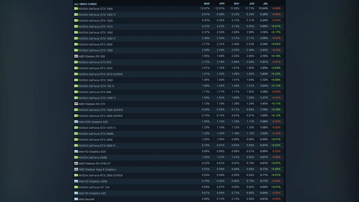 Пятерка самых популярных видеокарт по-прежнему не меняется. Это GTX 1060 (11,64%), GTX 1050 Ti (8,28%), GTX 1050 (5,24%), GTX 1070 (4,06%) и GTX 1650 (3,16%). Примечательно, что наиболее популярная видеокарта от AMD, а именно Radeon RX 580 поднялась в рейтинге (на 0,10%) и вошла в первую десятку (2,16% от общего количества пользователей).