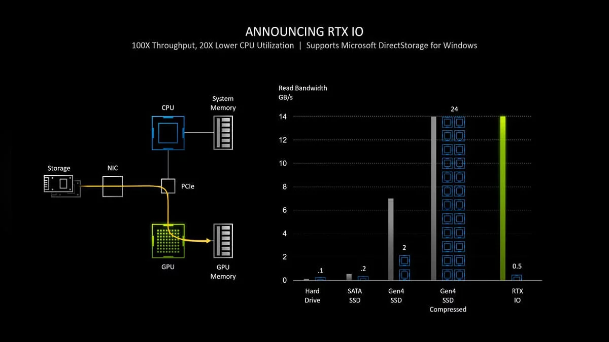 Сообщается, что RTX IO использует API Microsoft DirectStorage и обещает обеспечить значительный скачок производительности. Это достигается за счёт того, что графические данные будут передаваться прямо в GPU, минуя CPU и сопутствующие «узкие места». Это позволит увеличить производительность графической подсистемы в плане распаковки и обработки игровых ресурсов до 20 раз. В плане же производительности ввода-вывода говорится о приросте в 2 раза. Технически, это аналог функции из консолей Xbox Series X и PlayStation 5, что позволяет ускорить работу игр в целом.