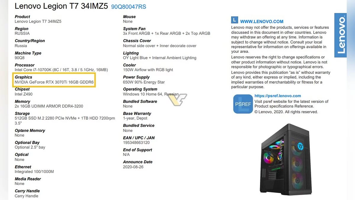 Речь идет об улучшенной RTX 3070 с приставкой Ti. Ее заметили на сайте Lenovo. В некоторых источниках эта модель видеокарты помечена как RTX 3070 Super. По сравнению со стандартной RTX 3070 (8 ГБ) она получит увеличенный объем видеопамяти GDDR6 — 16 ГБ.