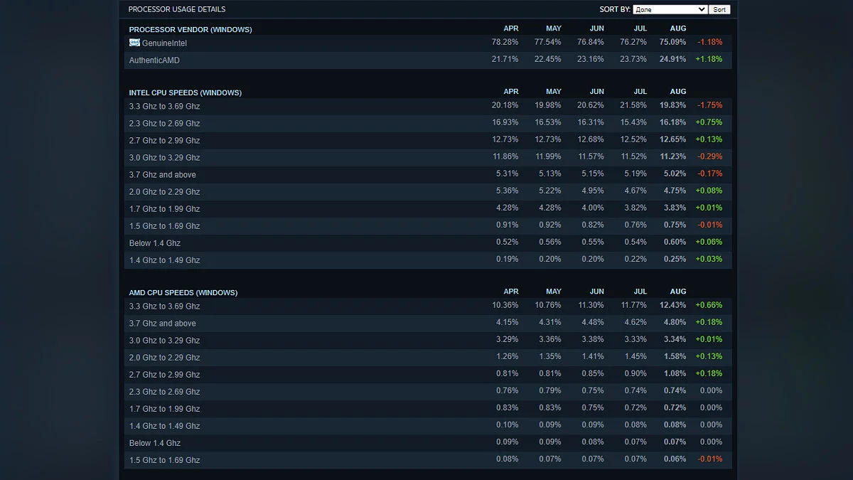С процессорами ситуация тоже почти не изменилась. Intel все еще сильно опережает AMD (75,09% против 24,91%), но «красные» медленно, но уверенно усиливают свои позиции на рынке. В августе их популярность в Steam повысилась на 1,18%.