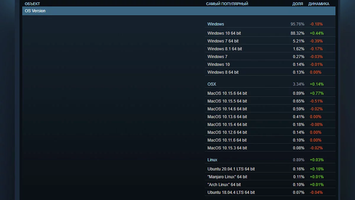 Что касается операционных систем, Windows 10 64 bit вновь показывает прирост в числе пользователей (на 0,44%). Общий показатель популярность этой ОС составляет 88,32%.