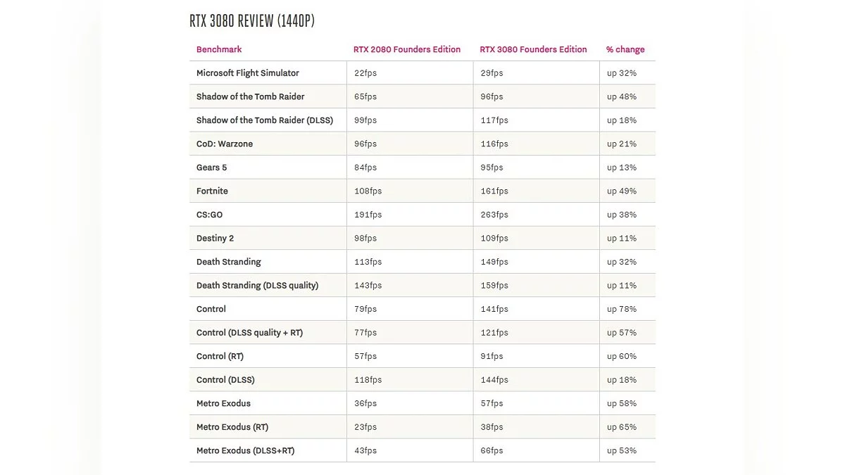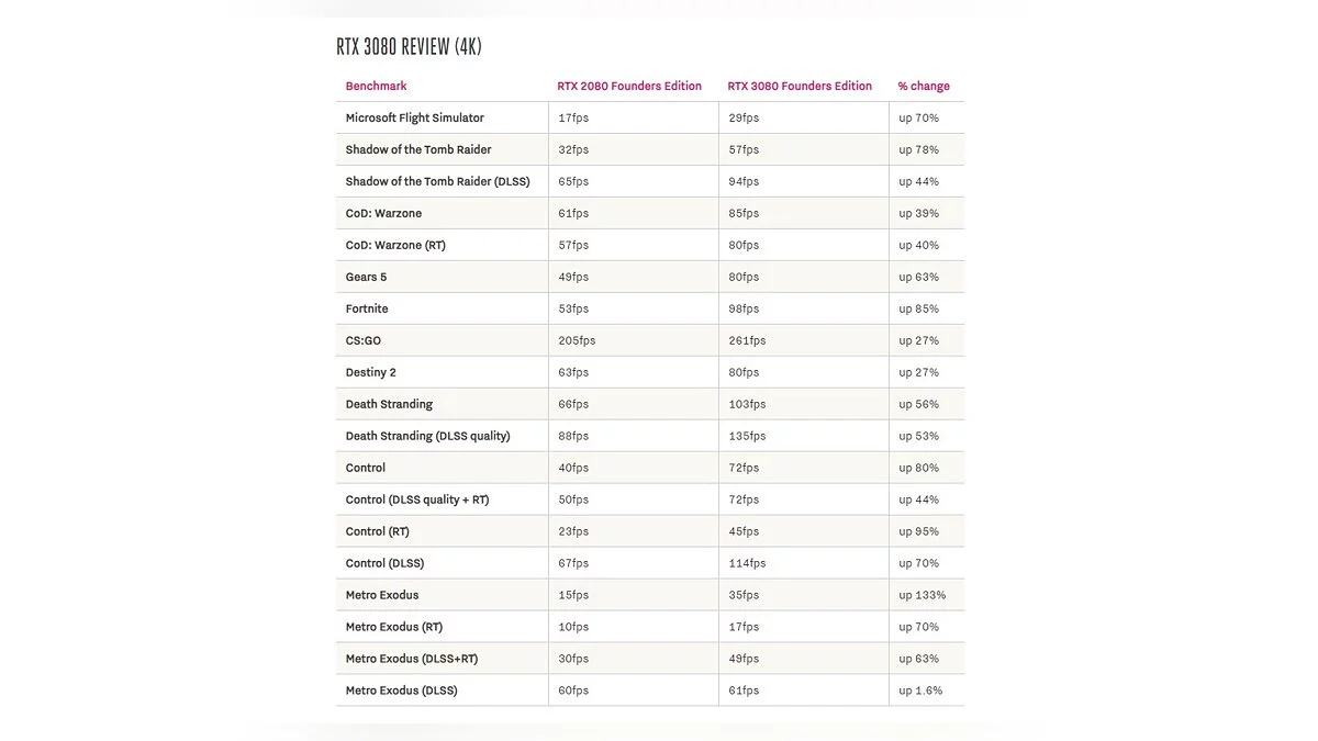 Ниже можно посмотреть результаты тестов RTX 3080 и прирост производительности по сравнению с RTX 2080. Ярче всего новая видеокарта показывает себя в разрешении 4K.