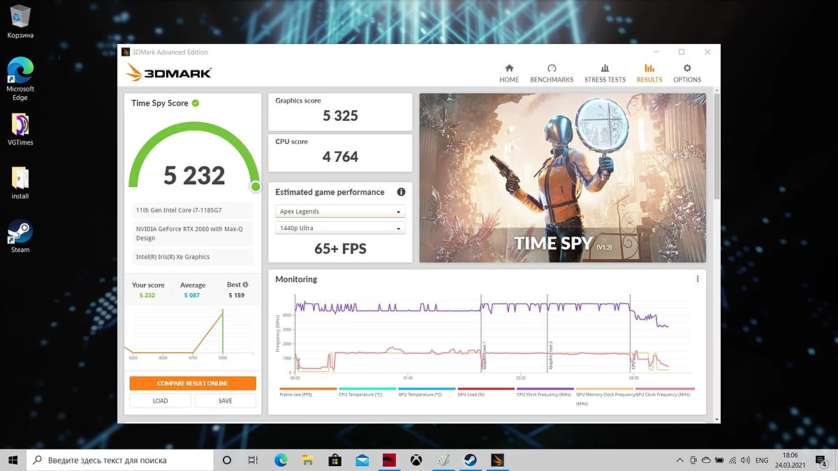 Также мы оценили мощность ноутбука и в 3DMark: в тестах Time Spy и Fire Strike Extreme. От RTX 2060 с 6ГБ видеопамяти сложно ожидать чего-то большего, но результаты MSI Stealth 15M вполне удовлетворительные.