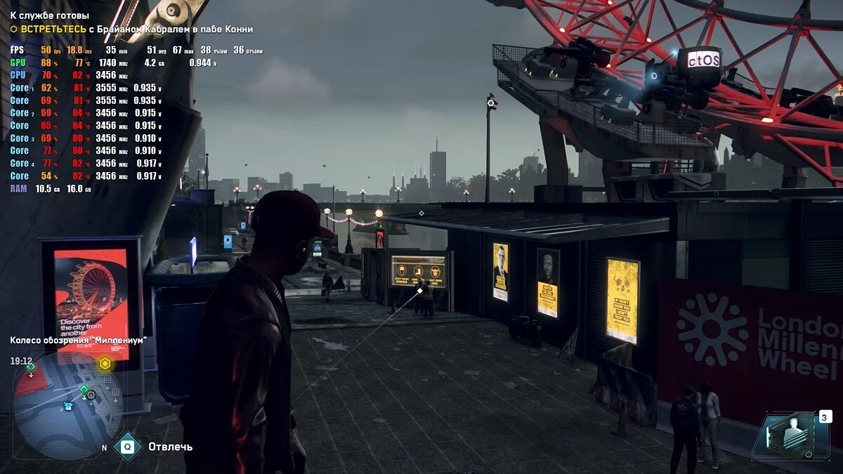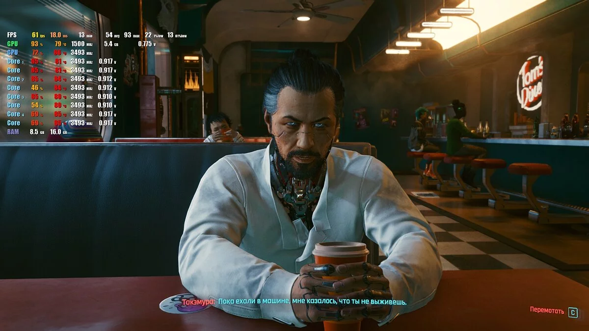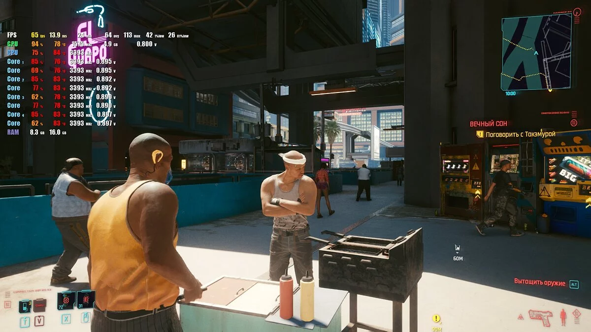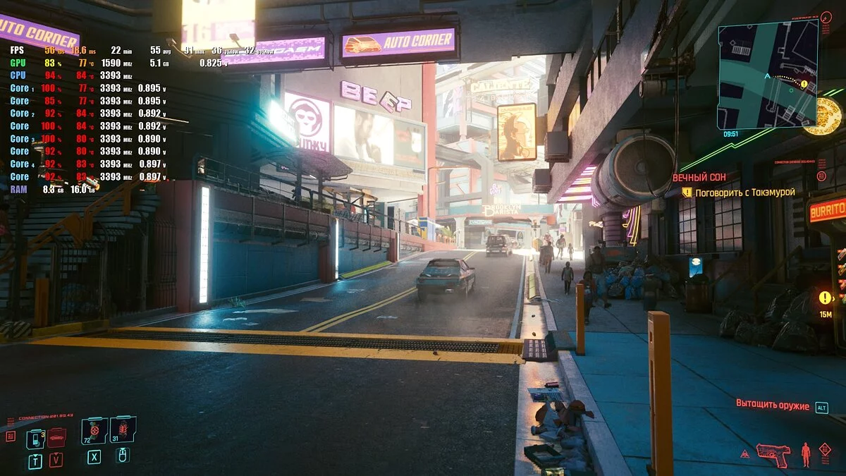 В Cyberpunk 2077 мы остановились на высоких настройках графики с включенным DLSS в режиме производительности. Трассировку лучей оставили на минимуме. 60 кадров в секунду игра показывает, но стабильными их не назовешь — плотность населения в кадре и объем детализации города сильно влияет на FPS.