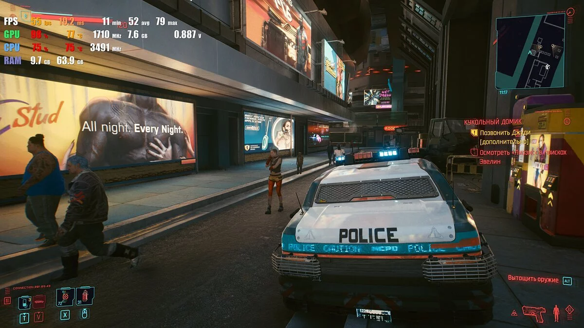 Cyberpunk 2077. Игра CD Projekt RED после всех патчей остаётся одной из самых требовательных на рынке. Даже с выключенной трассировкой нам не удалось заполучить заветные стабильные 60 кадров в секунду на ультра-настройках. При выставленной сбалансированной настройке DLSS Cyberpunk 2077 показал в среднем около 50 FPS.