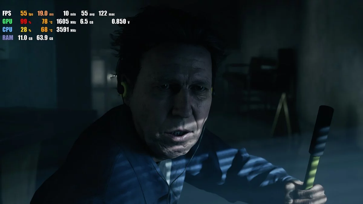 Control. Мы использовали DLSS в разрешении рендеринга 1920х1080 пикселей, остальные настройки все были выставлены на максимум, включая трассировку лучей. В таком режиме стабильных 60 FPS достичь не удалось, и Control заигрывала со средними 50-55 FPS.