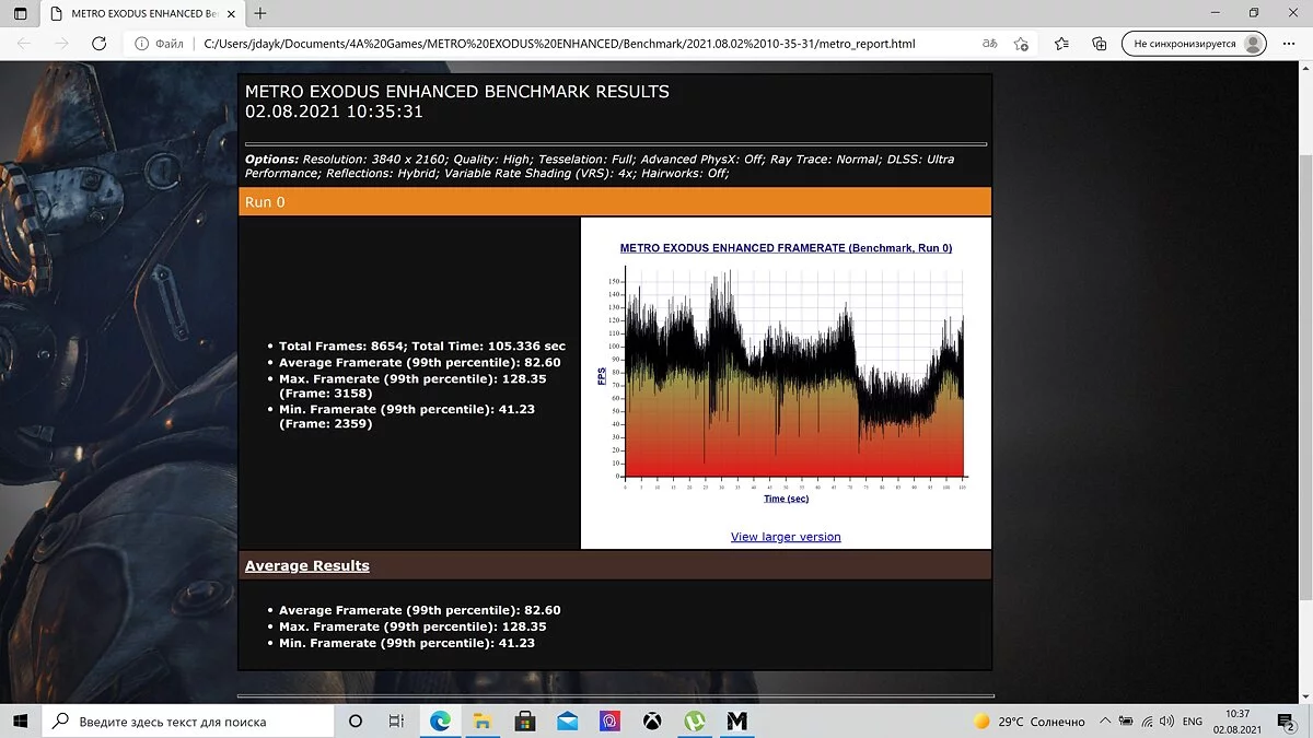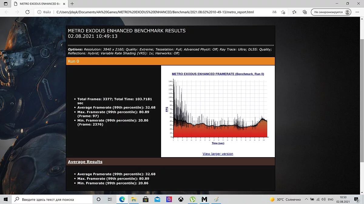 Ожидаемо, экстремальные настройки графики с наилучшей трассировкой в 4K всё же не позволят насладиться плавной картинкой. Средний показатель в тесте остановился на 32 FPS. Но снизив настройки до ультра или высоких, можно получить заветные 60 FPS без просадок.
