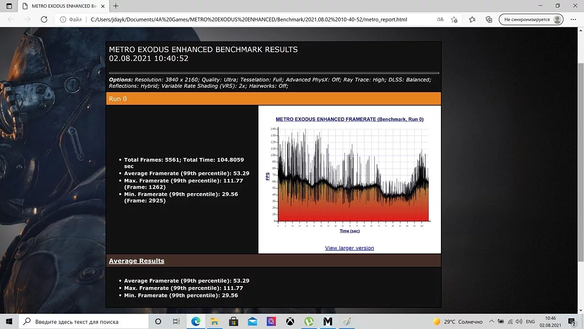 Metro Exodus Enhanced Edition. Теперь, когда игра поддерживает DLSS 2.0 и полноценную трассировку лучей, её можно назвать завсегдатаем наших тестов. Мы прогнали ноутбук в трёх встроенных пресетах с включённым рейтресингом.