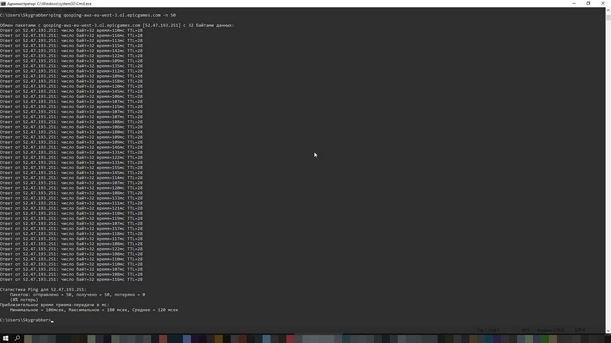 На примере европейских серверов Fortnite это можно сделать следующим образом. Откройте командную строку. Для этого нажмите Win + R и введите CMD. В появившемся окне наберите команду ping qosping-aws-eu-west-3.ol.epicgames.com -n 50 и нажмите Enter. Программа передаст 50 пакетов и покажет ваш минимальный и максимальный пинг. Обратите внимание, что после команды ping можно прописать любой адрес, например vgtimes.ru.