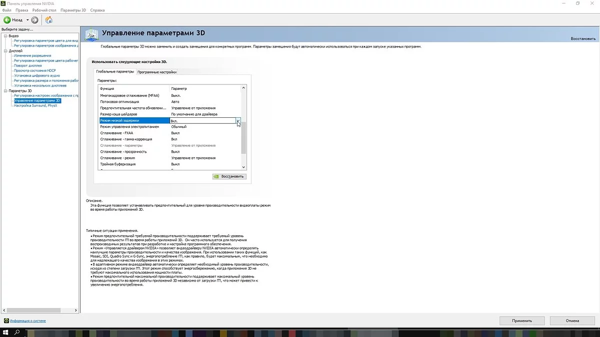 Включите режим низкой задержки. Также в панели управления NVIDIA можно включить режим низкой задержки. По своему эффекту он похож на NVIDIA Reflex, но работает только в DirectX 11. Про все настройки панели управления мы писали в гайде «Как настроить видеокарту NVIDIA для игр». У видеокарт AMD есть схожая функция — Radeon Anti-Lag, которую тоже можно включить в настройках дрйвера.